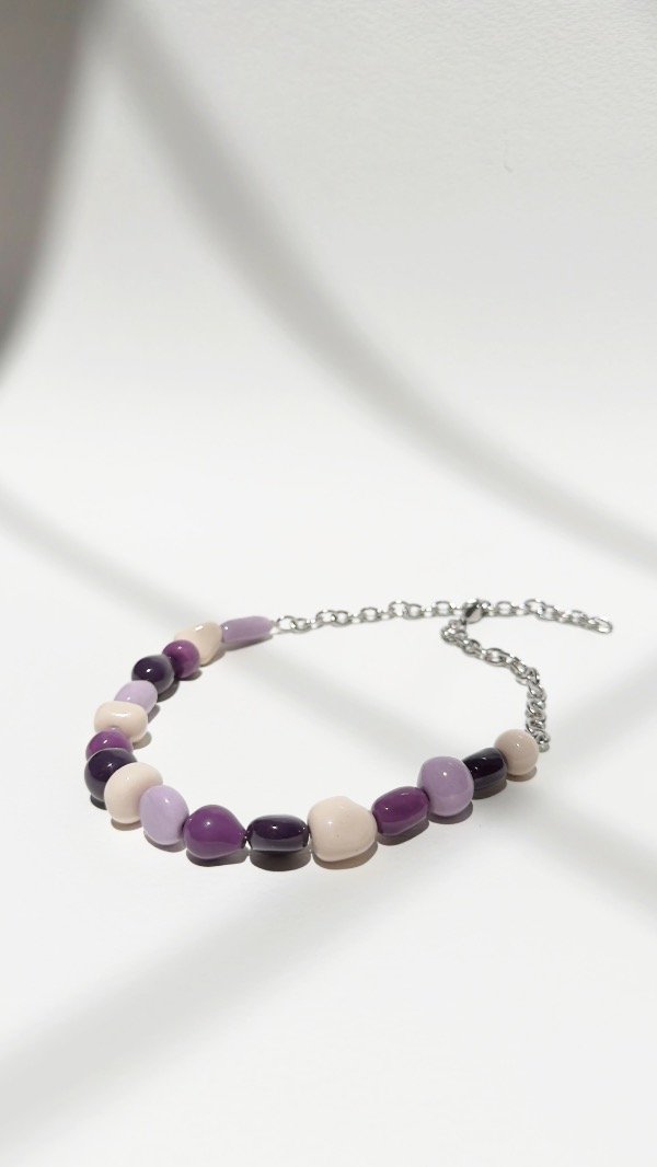 Collar de mostacillas de cerámica, cada una es modelada a mano y completamente esmaltada, la cadena es de acero quirúrgico de eslabón grande permitiéndote regular su largo.