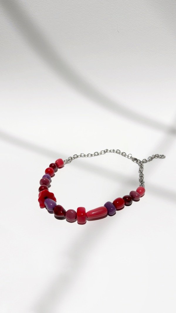 Collar de mostacillas de cerámica, cada una es modelada a mano y completamente esmaltada, la cadena es de acero quirúrgico de eslabón grande permitiéndote regular su largo.