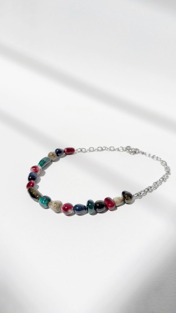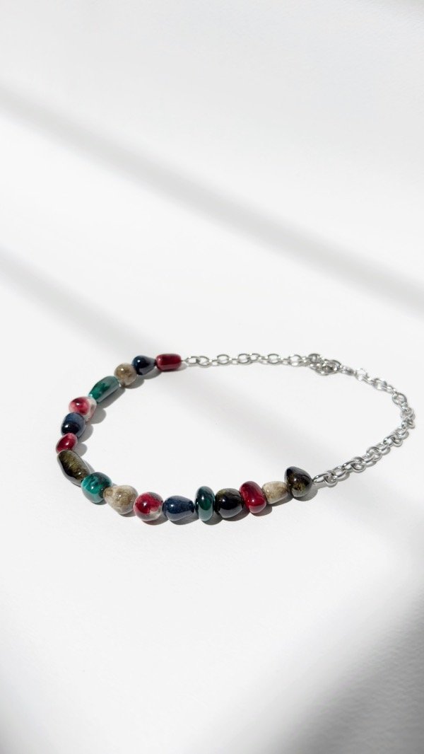 Collar de mostacillas de cerámica, cada una es modelada a mano y completamente esmaltada, la cadena es de acero quirúrgico de eslabón grande permitiéndote regular su largo.