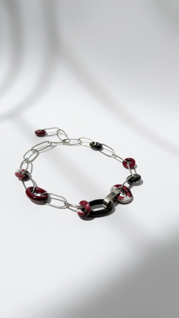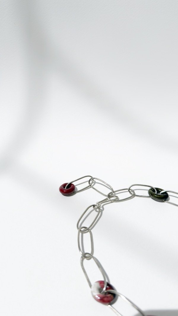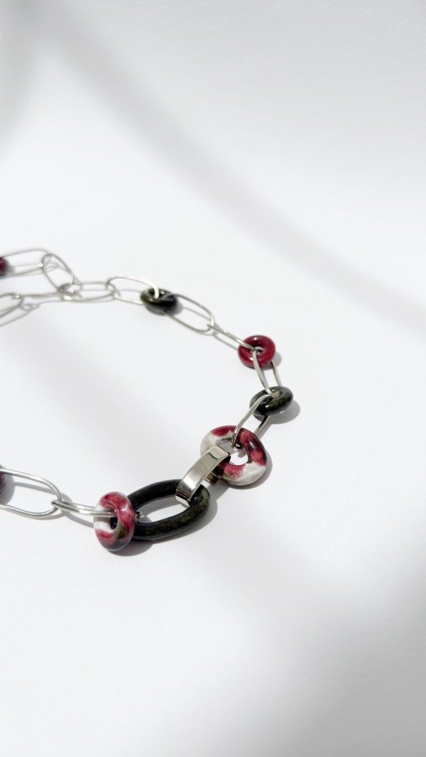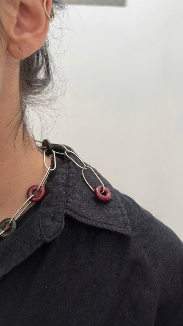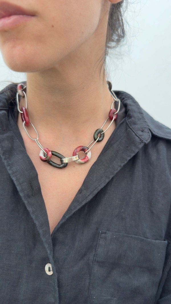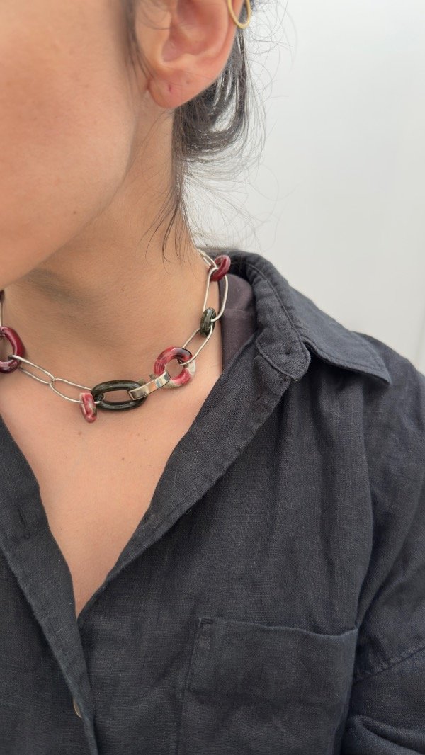 Collar único de eslabones grandes, fue confeccionado por completo dentro del taller, las piezas de cerámica son modeladas a mano y se encuentras completamente esmaltadas.